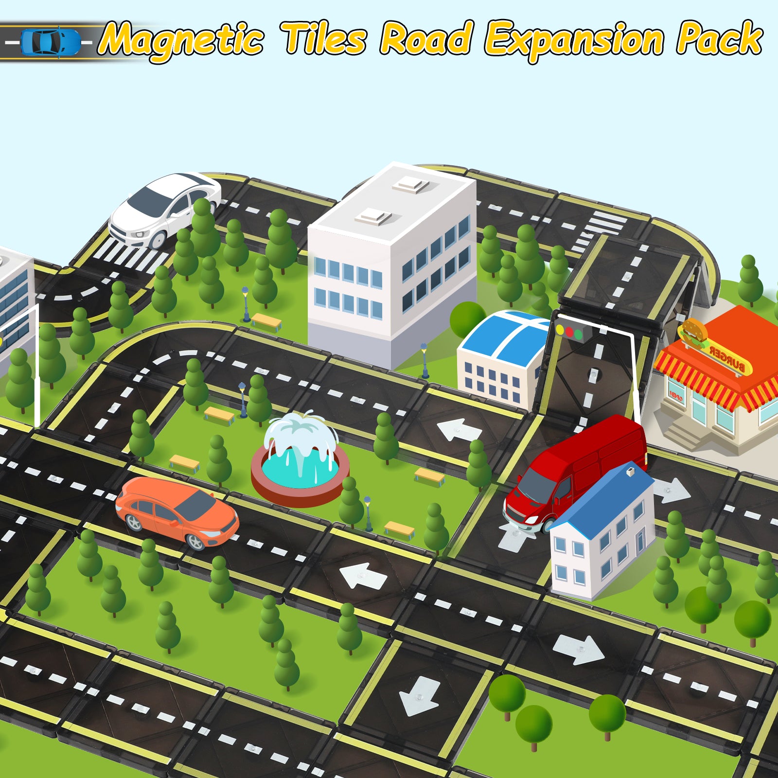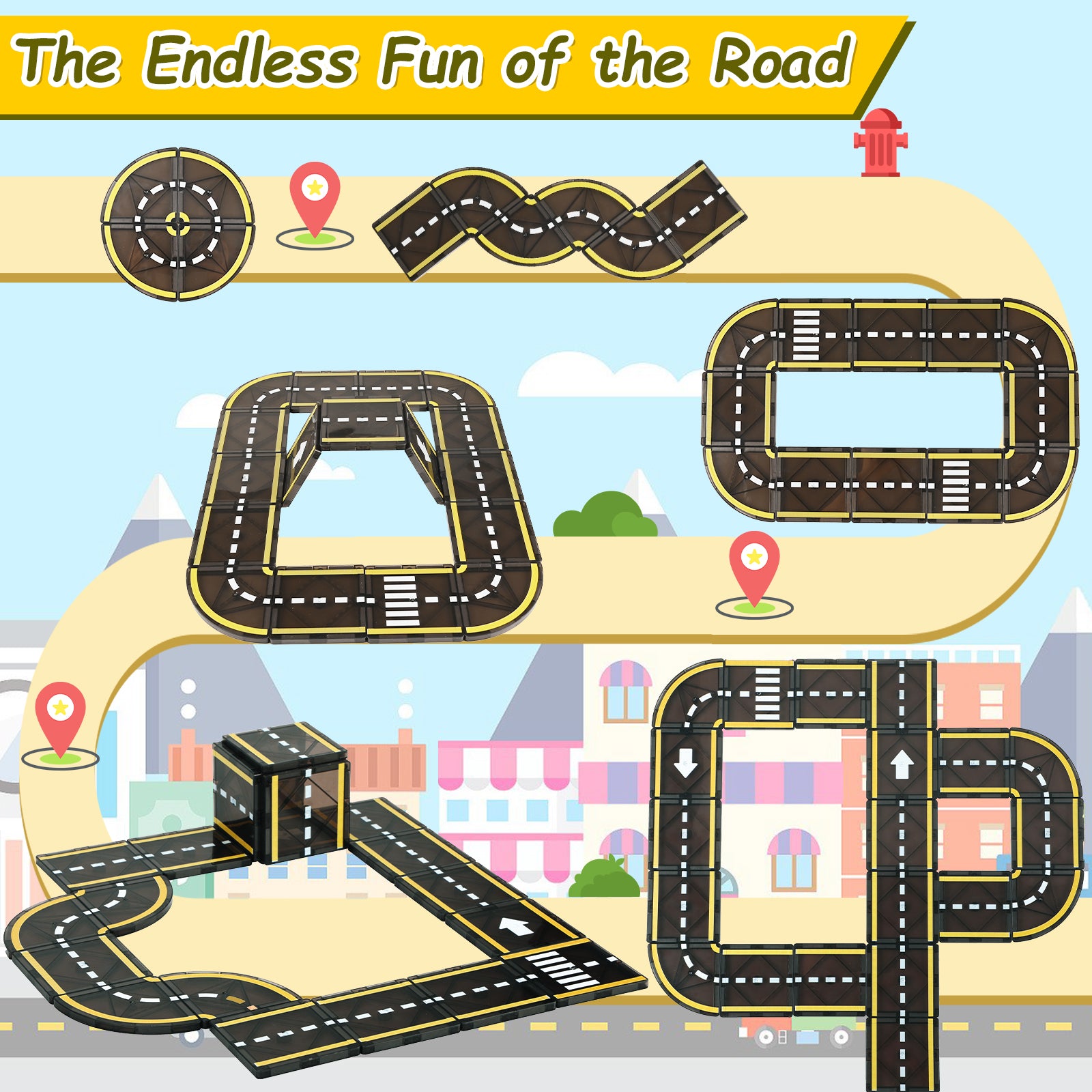 【Much Loved Magnetic Tiles Road】This is the magnetic tiles road set that kids have been eagerly waiting for, which can be used as a supplementary pack to connect with your existing magnetic building blocks. The magnetic road tiles set consists of 20 road tiles. It is a set that only includes road elements, so you don't have to worry about other accessories that you don't want. Add the magnet tiles road set to your toy collection and let kids continuously explore new road designs and architectural plans, keeping their interest and creativity alive.