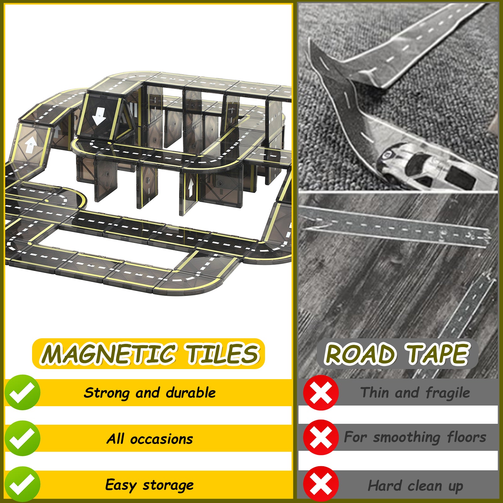 2.【Portability】The magnetic design of the tile roads makes them easy to dismantle and move, allowing kids to build roads in different rooms at home or outdoor areas, creating various environments and scenes. This flexibility makes magnetic tile roads a very cool outdoor toy for toddlers.